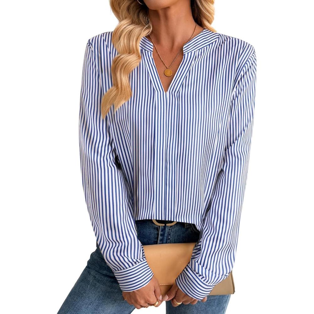 imageAvanova Women Boho Printed V Neck Tops Long Sleeve Shirts Work BlousesBlue Striped