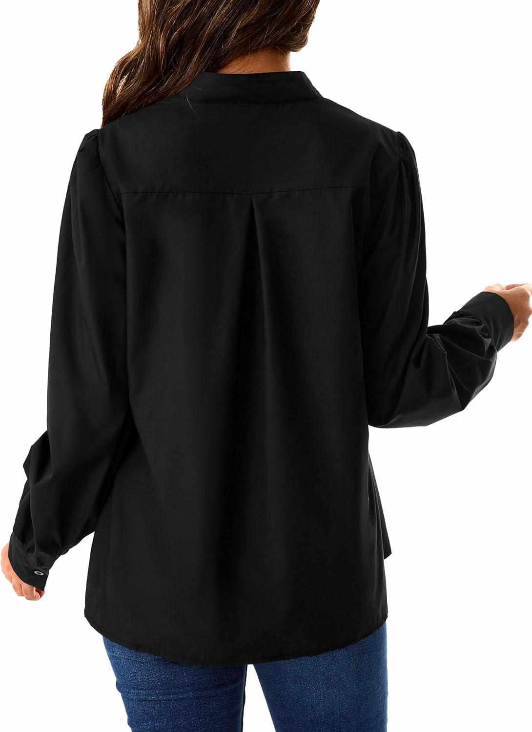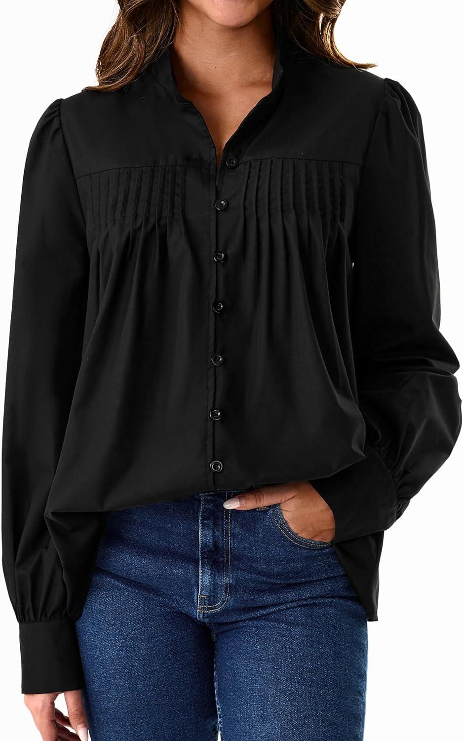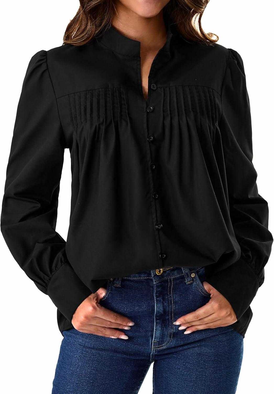 Avanova Women Button Down Up Shirts Long Sleeve Blouses Pleated Mock Neck Tops Black Small