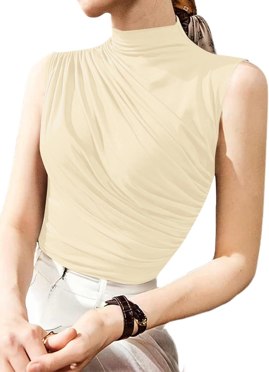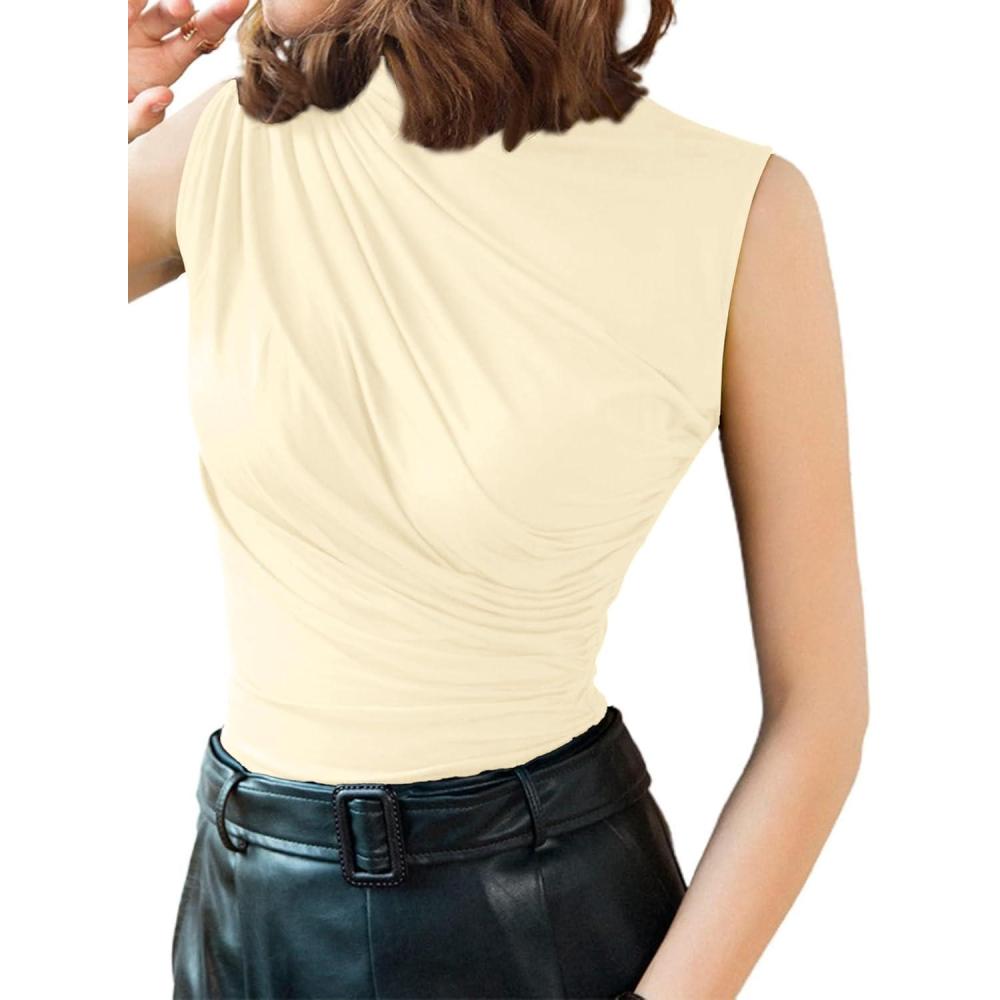 Avanova Women Fitted Sleeveless Ruched Tank Top Shirt Mock Turtleneck Blouses(Beige)