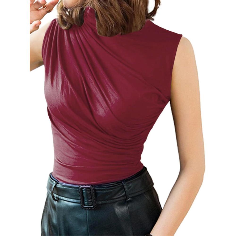 Avanova Women Fitted Sleeveless Ruched Tank Top Shirt Mock Turtleneck Blouses(Burgundy a)