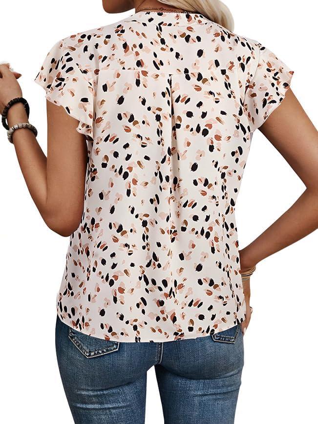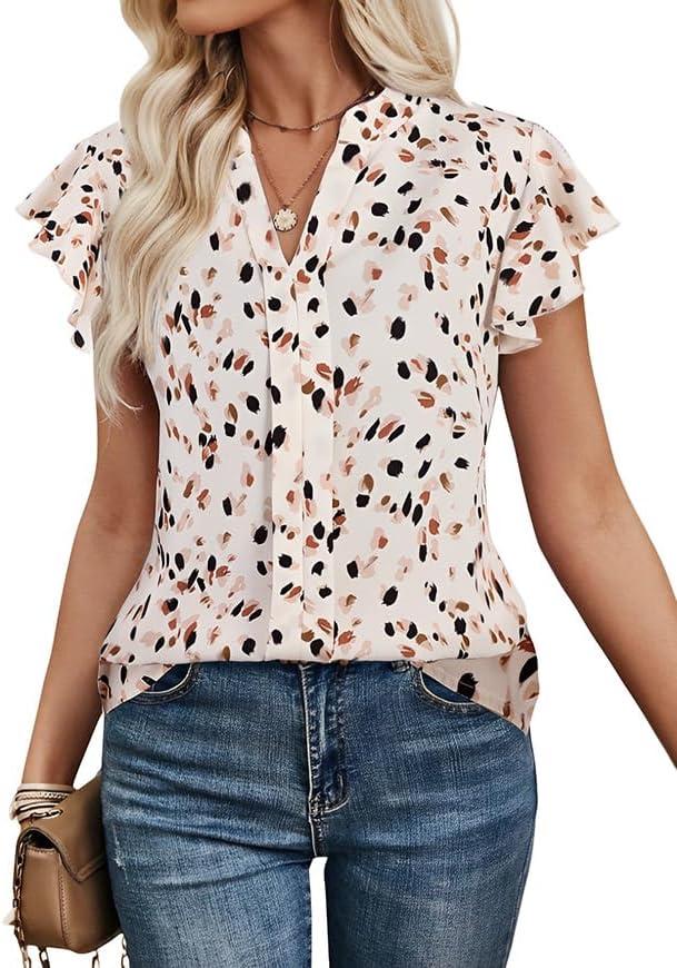Avanova Women V Neck Short Sleeve Blouses Top Floral Flutter Sleeve Ruffle Sleeve Dressy Work Shirt for Ladies De Mujer Woman Women's Dressy Wear.