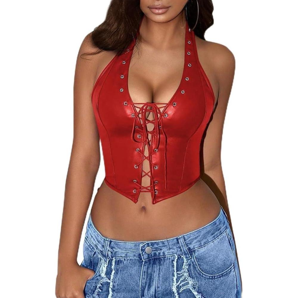 Avanova Women Halter Crop Top Lace Up Corset Leather Deep V Neck Open Back Going Out Sexy Tank Top for women ladies