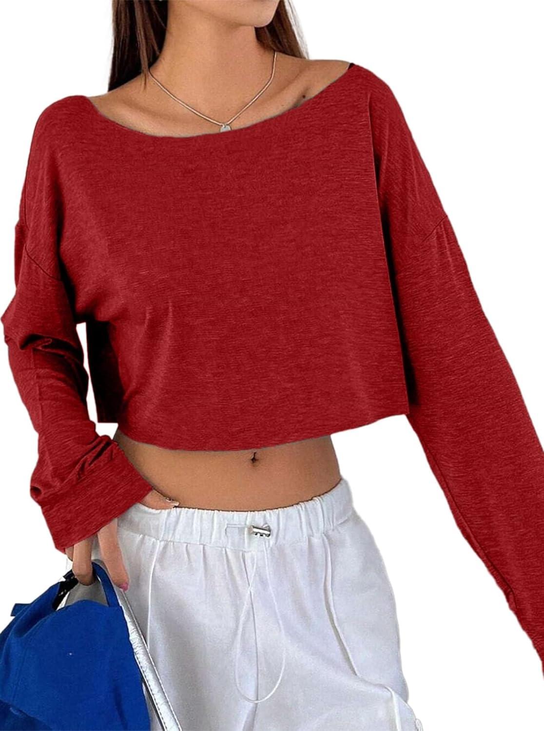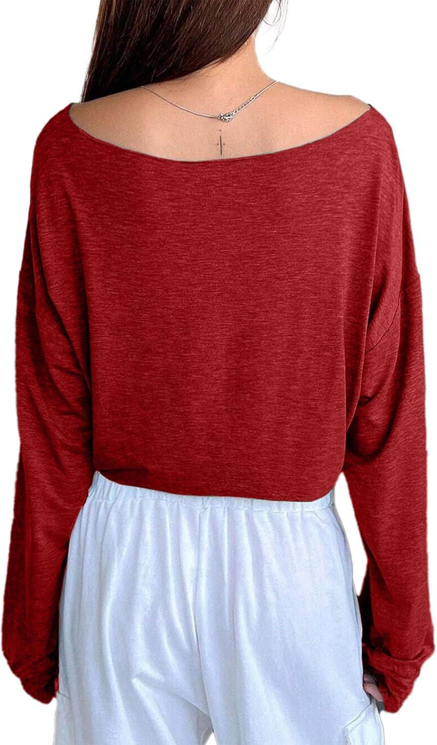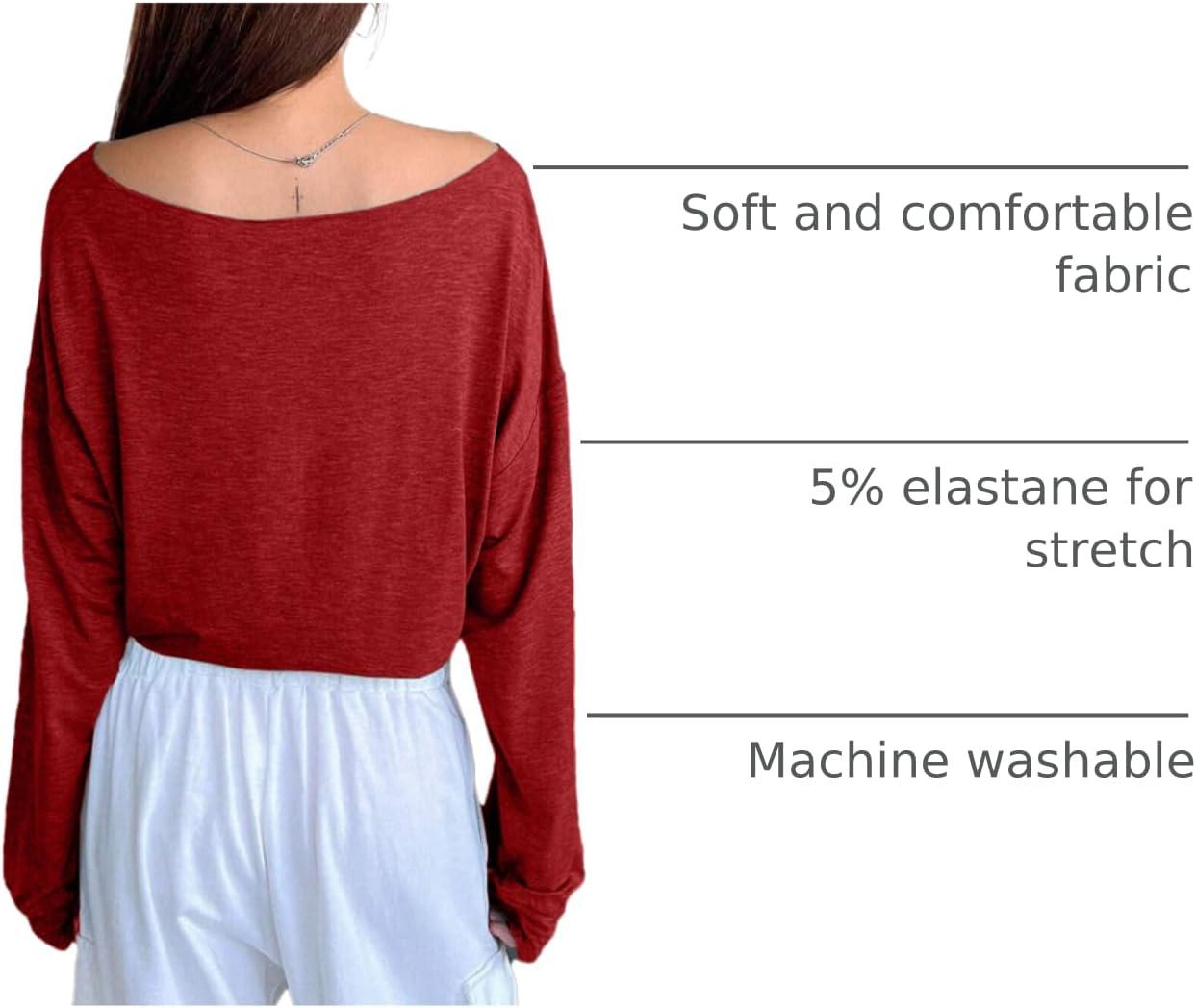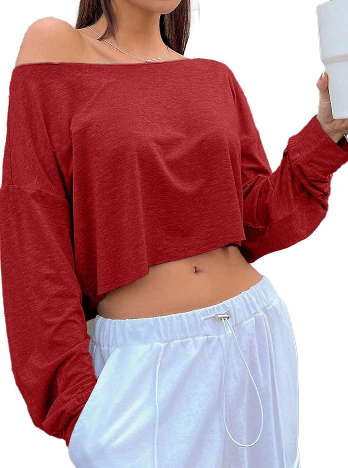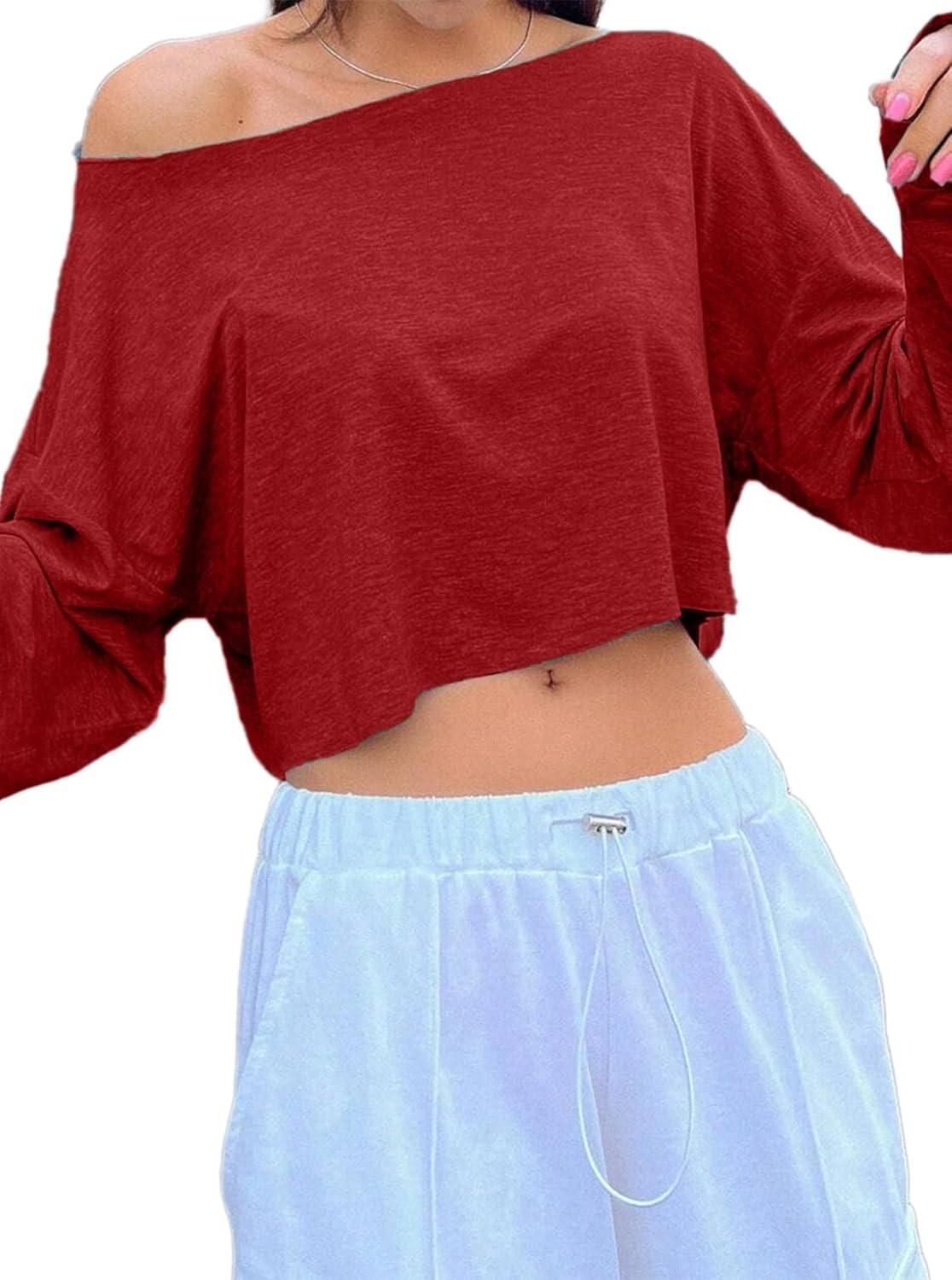 Avanova Women Off The Shoulder Crop Tops Long Sleeve T Shirts Oversized Loose Tee(Red)