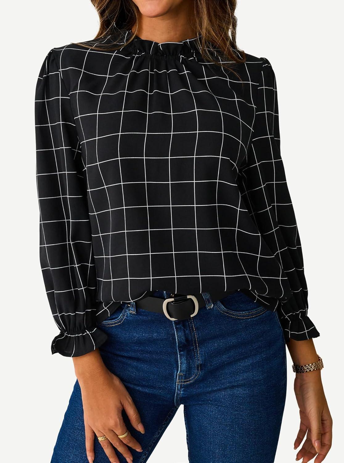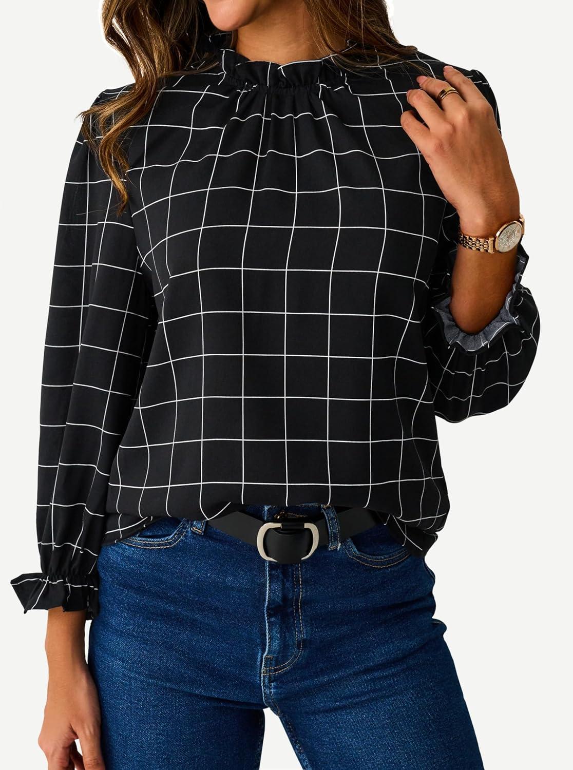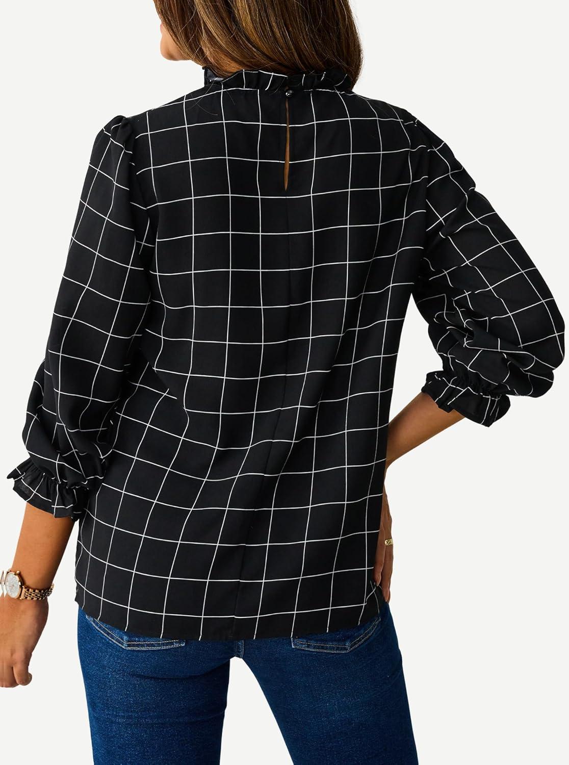 Avanova Women Polka Dot Long Sleeve Blouse Shirts Work Mock Neck Ruffle Top(Plaid Black)