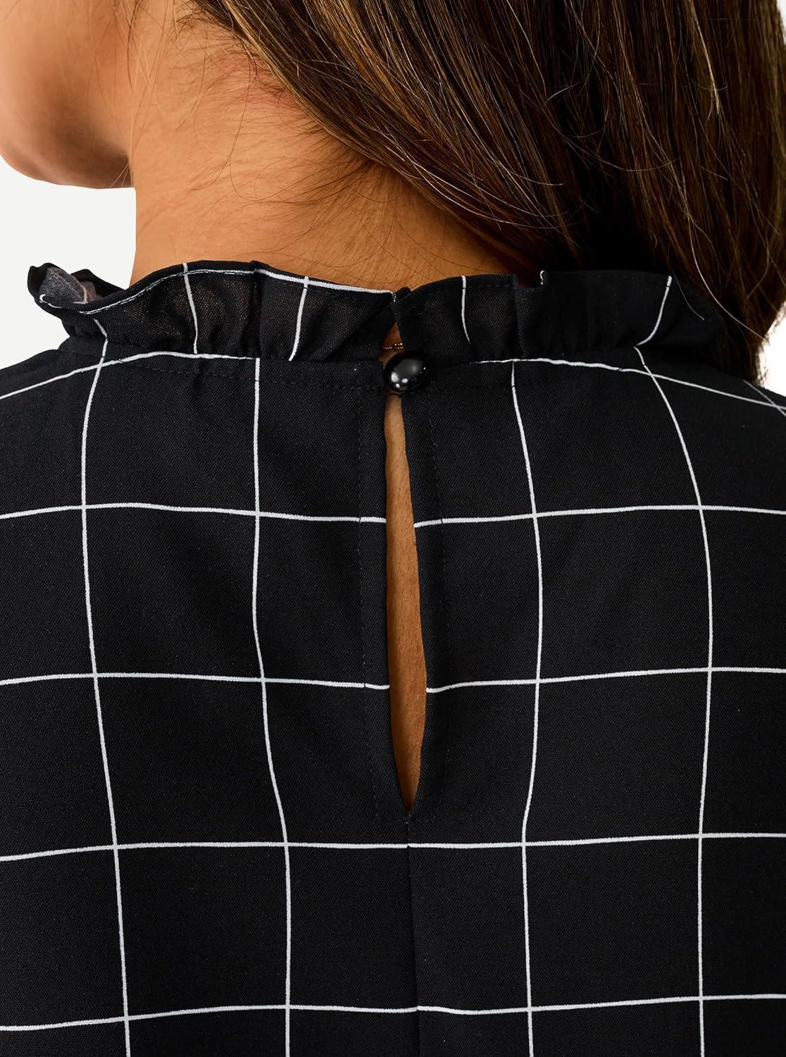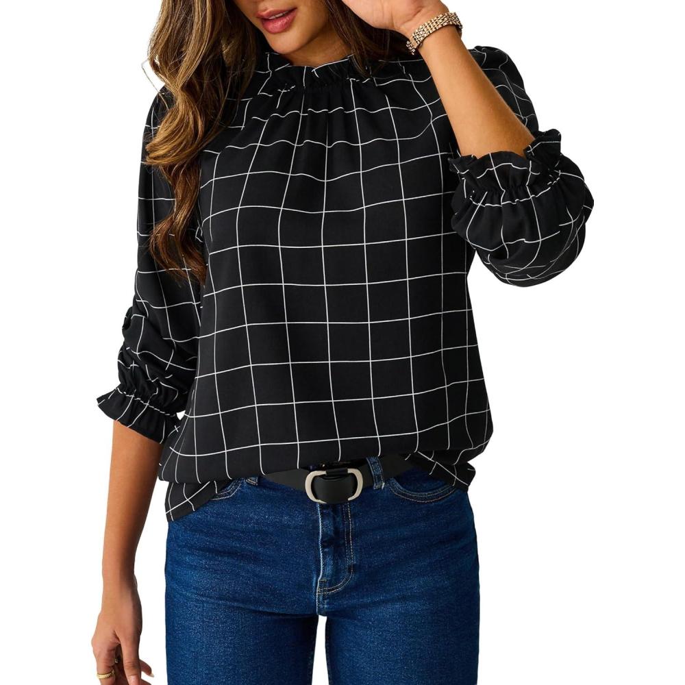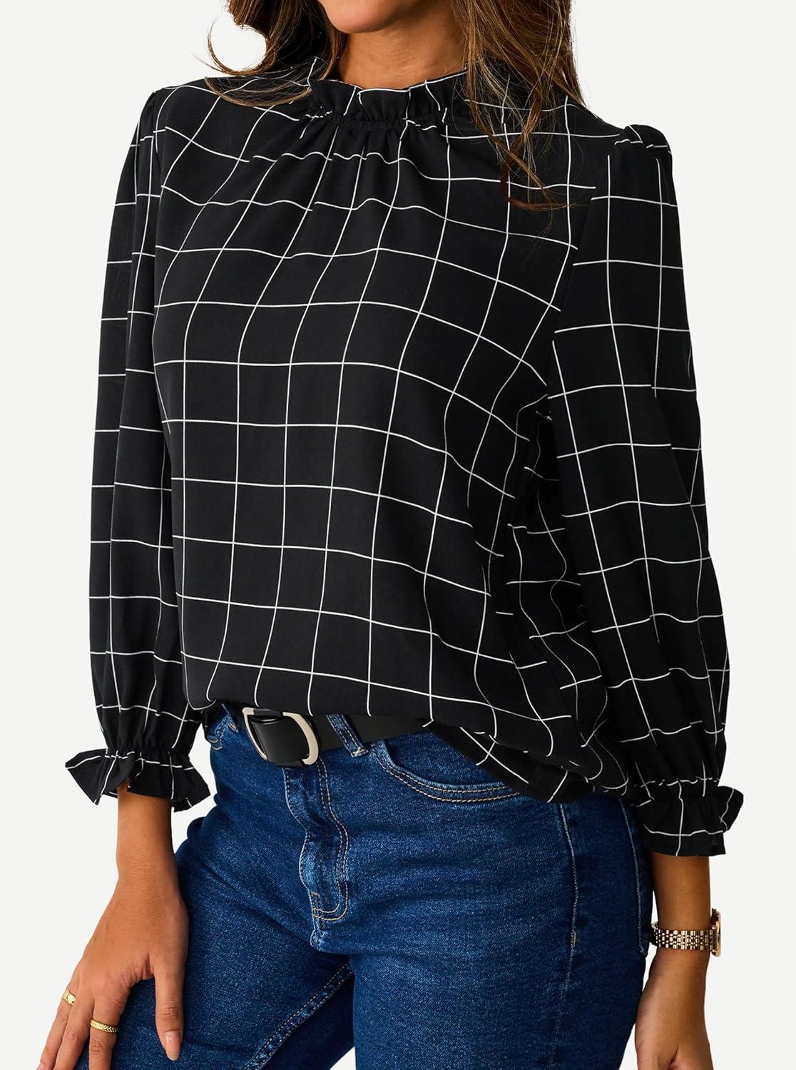 Avanova Women Polka Dot Long Sleeve Blouse Shirts Work Mock Neck Ruffle Top(Plaid Black)