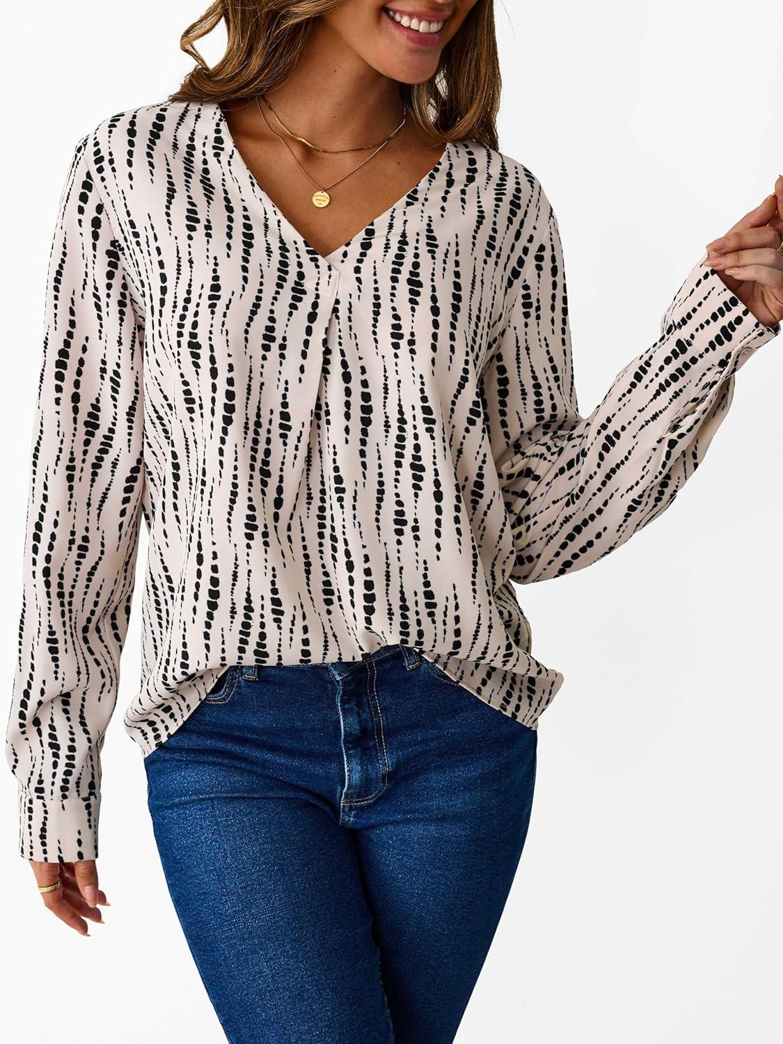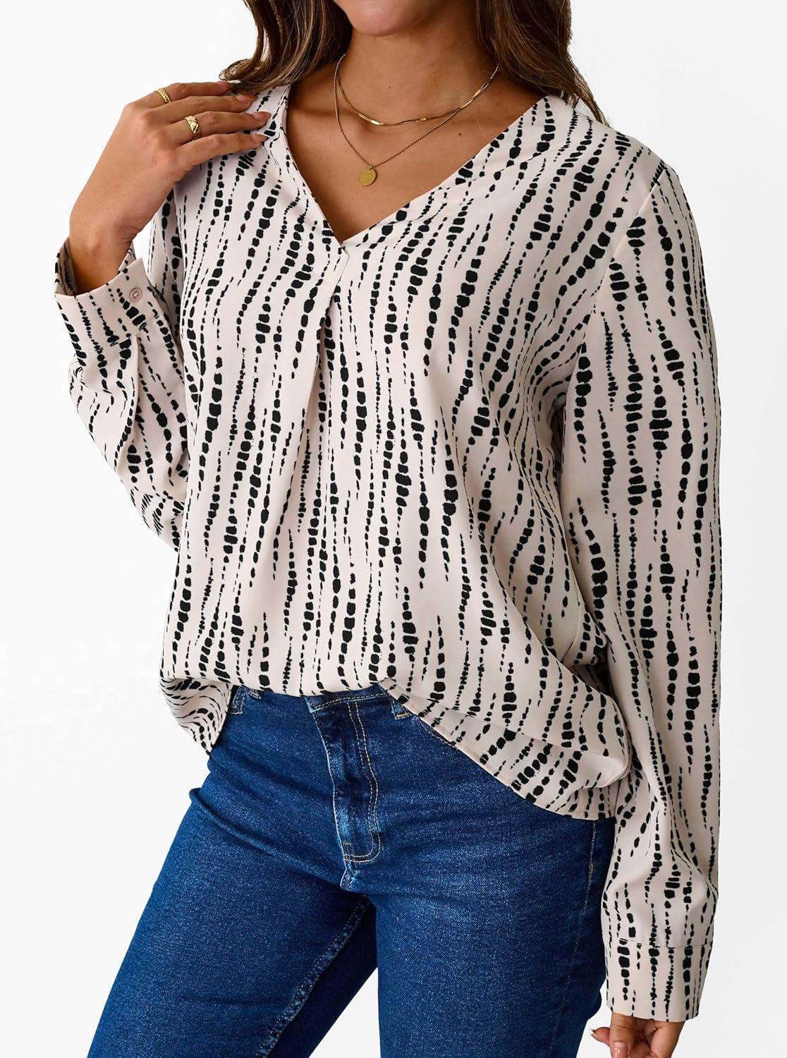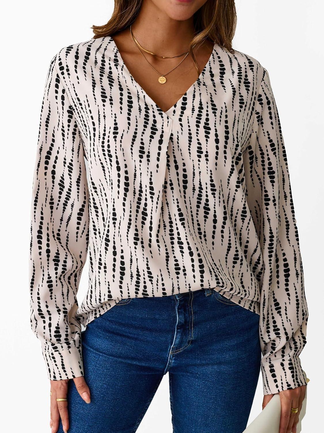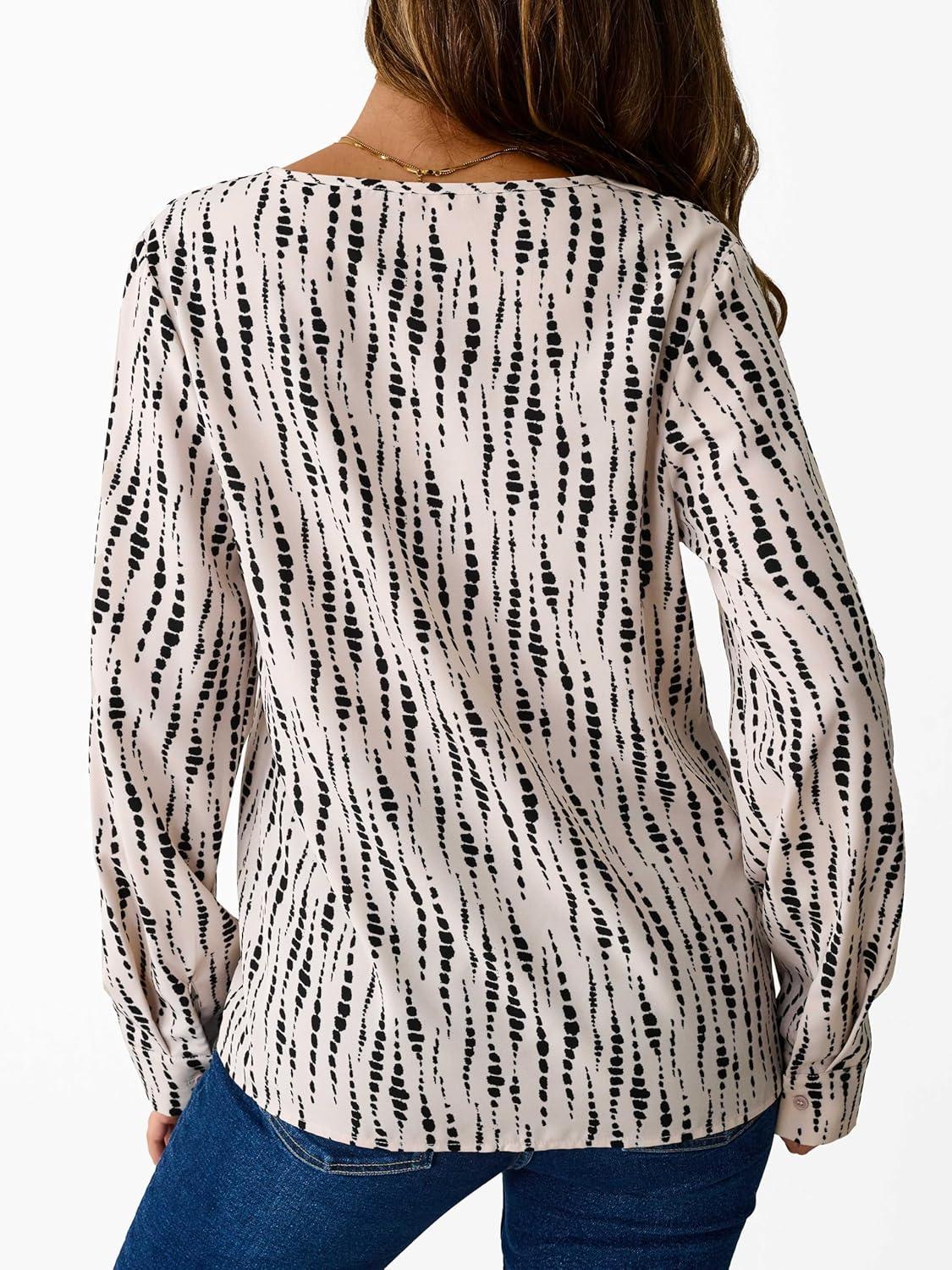 Avanova Women Boho Printed V Neck Tops Long Sleeve Shirts Work Blouses(Black Beige)