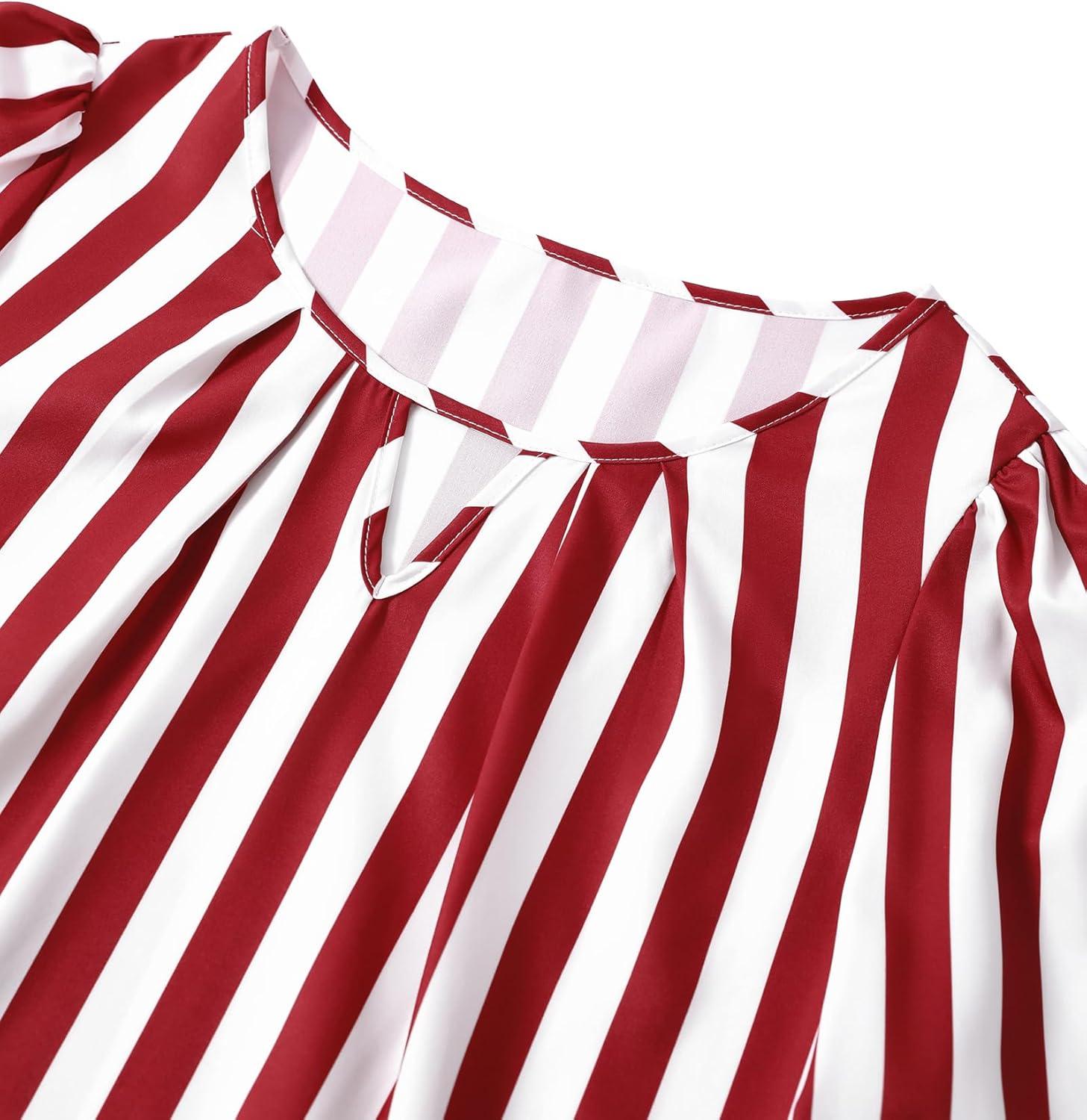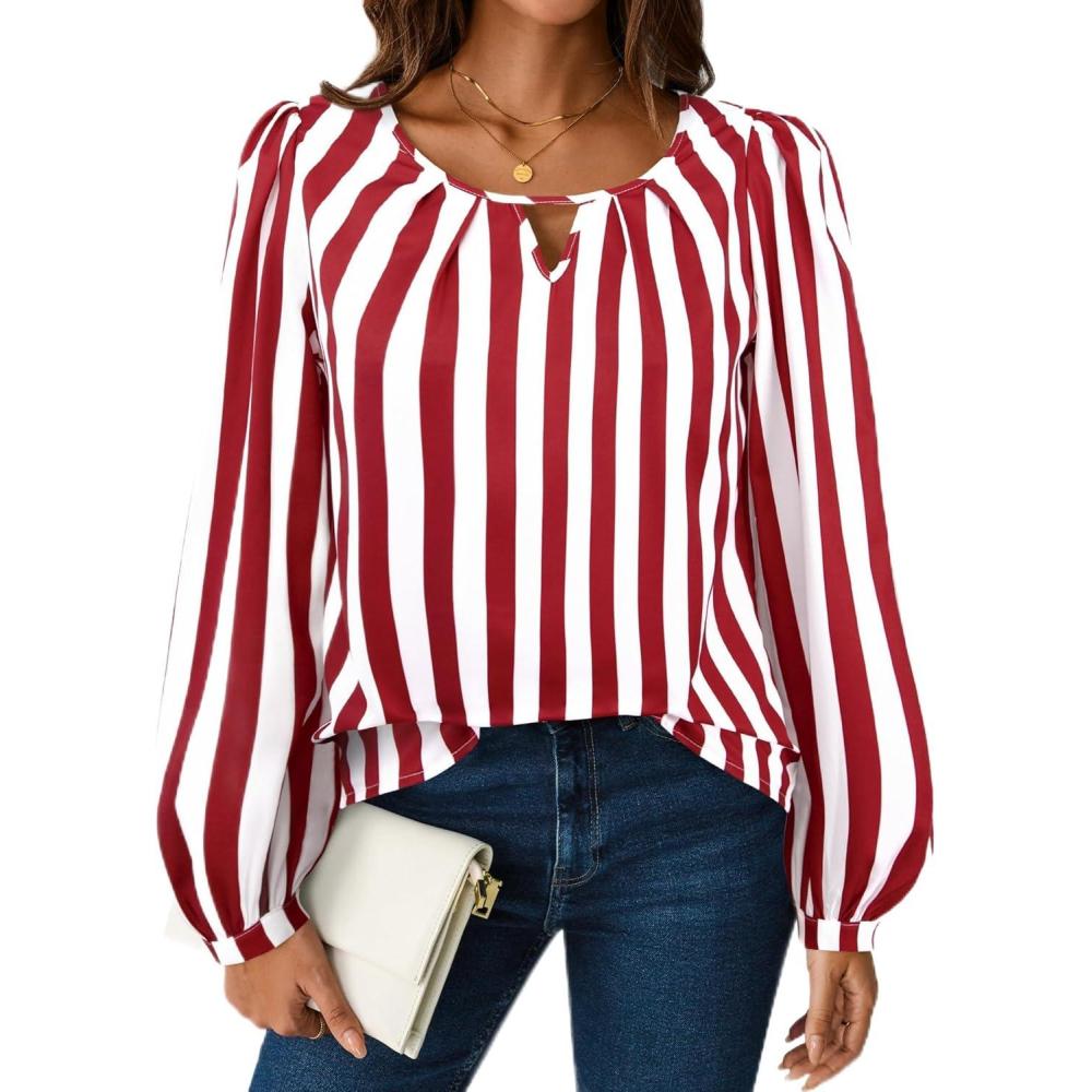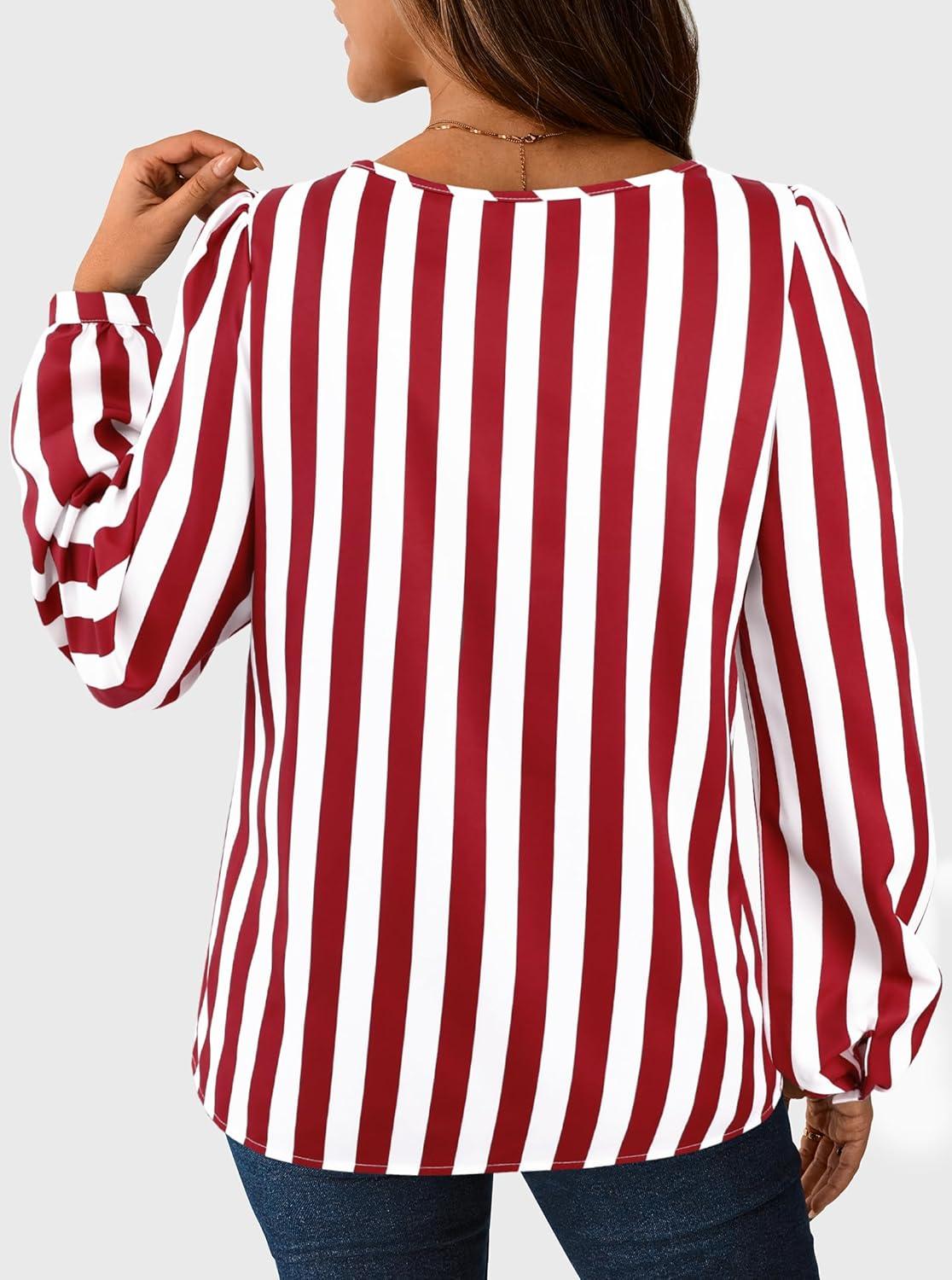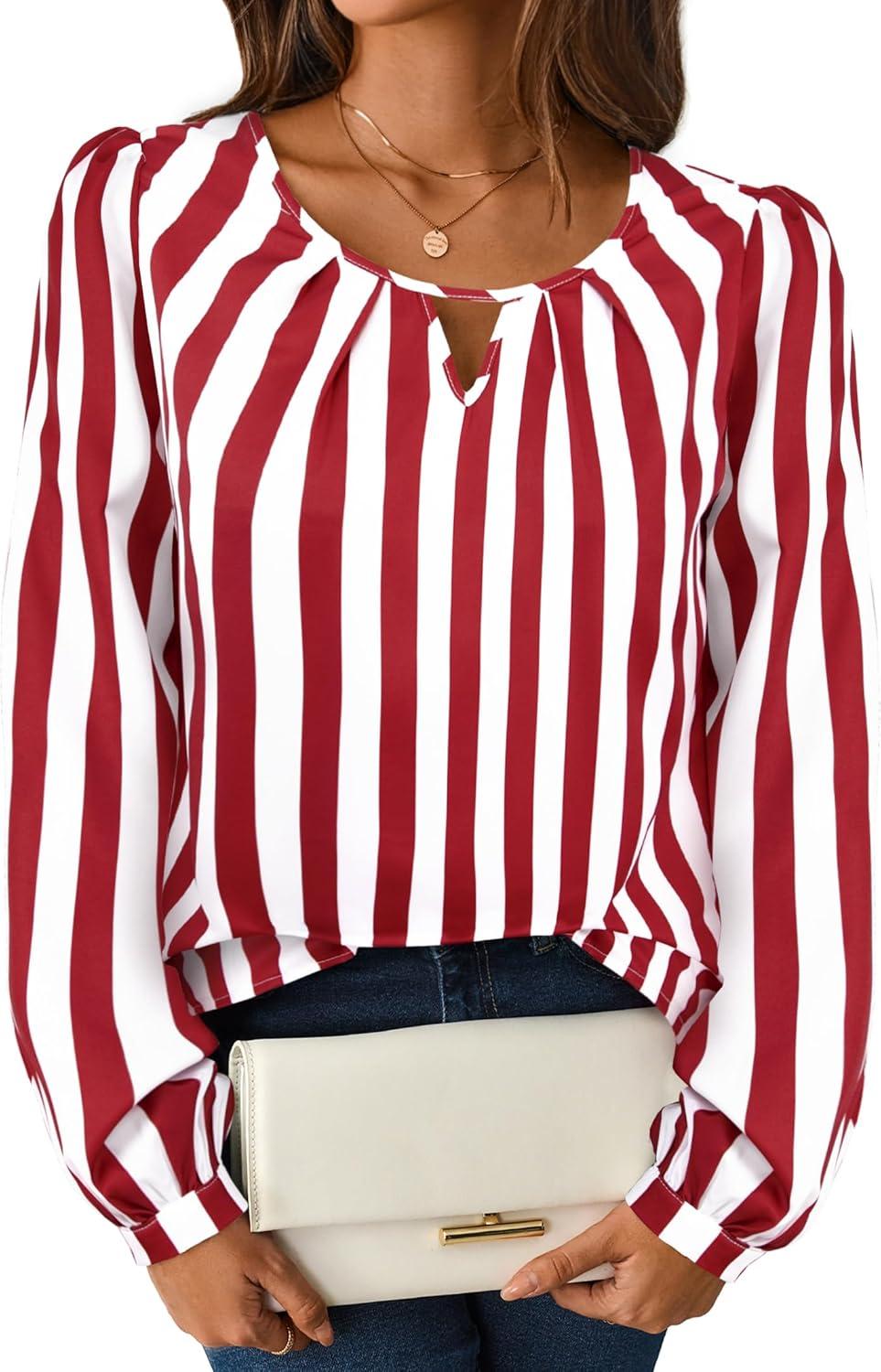 Avanova Women Striped Blouse Keyhole Tops Long Sleeves Work Business Casual Shirt(Red)