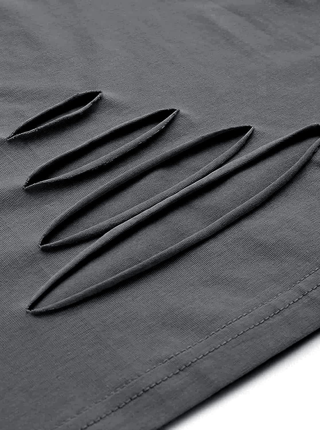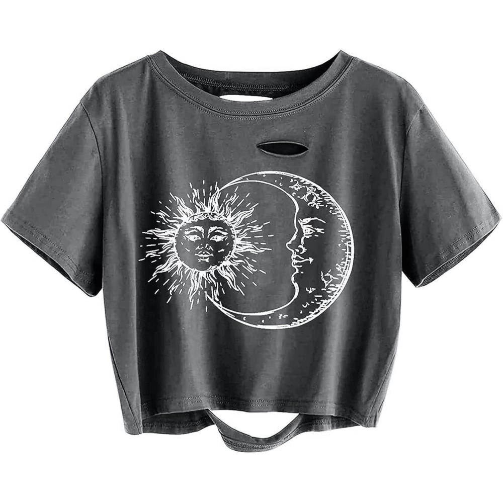 Avanova Women Sun Moon Graphic Distressed Crop Top Oversized Short Sleeve Ripped Tee Shirt(Dark Grey)