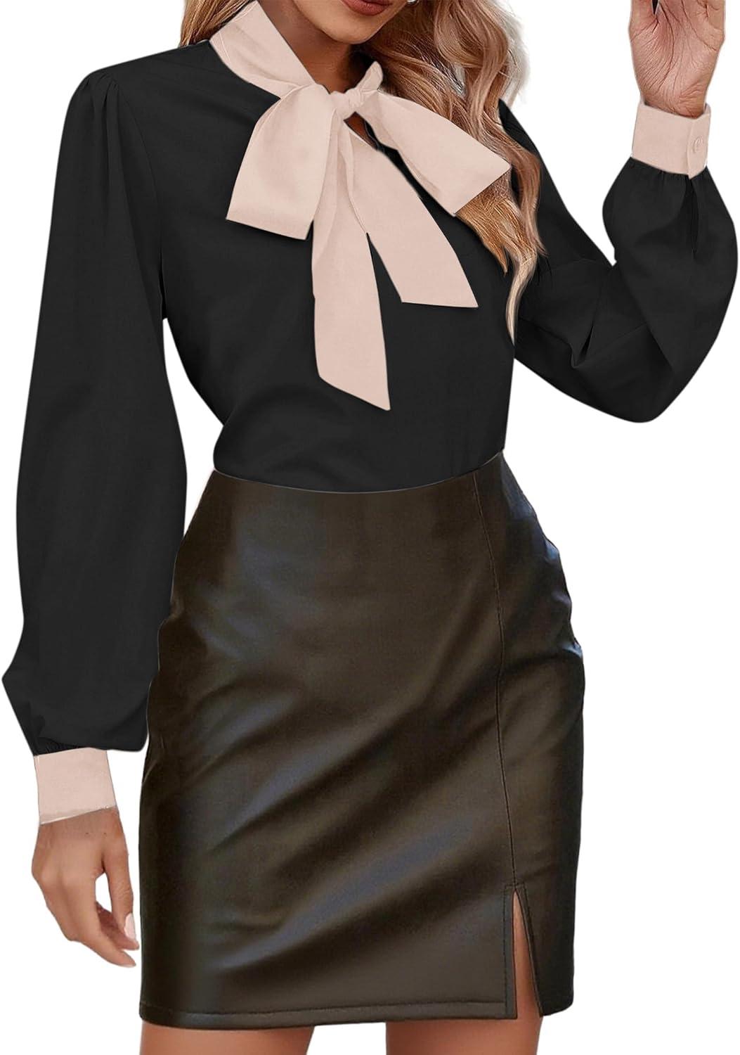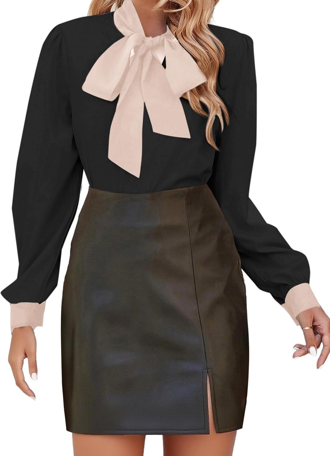 Avanova Women Tie Neck Bishop Long Sleeve Shirts Casual Work Blouses Tops(Black)