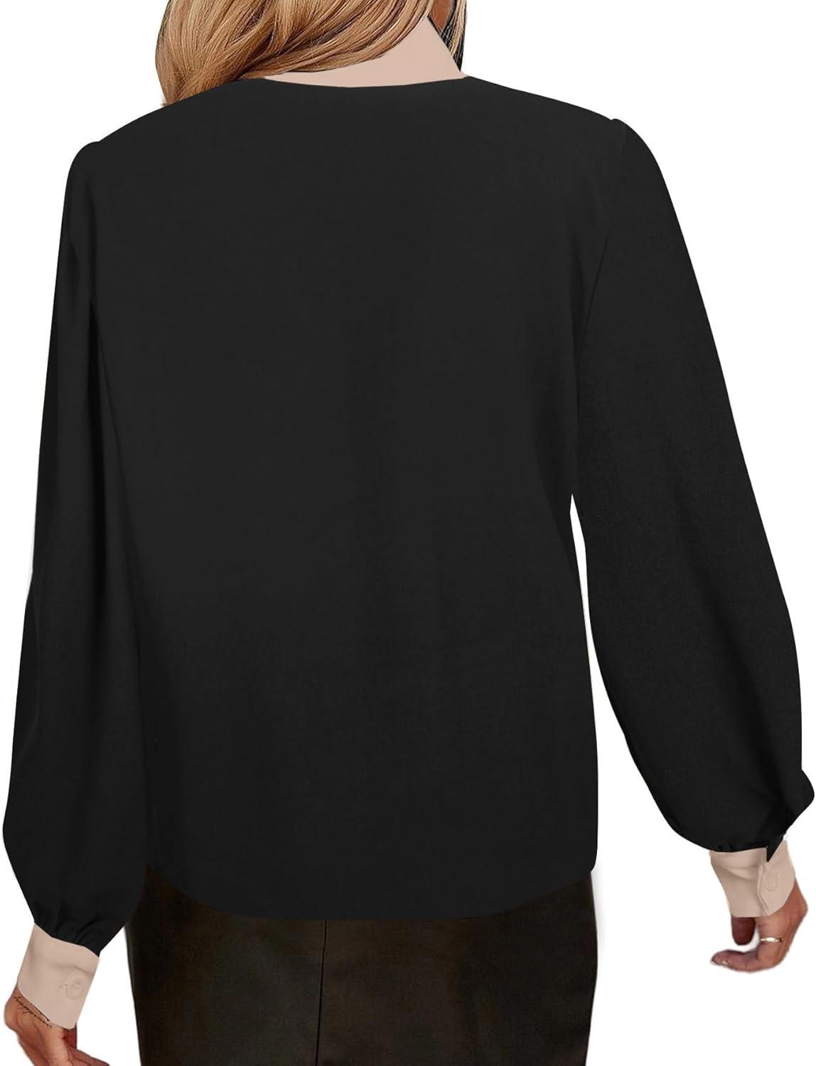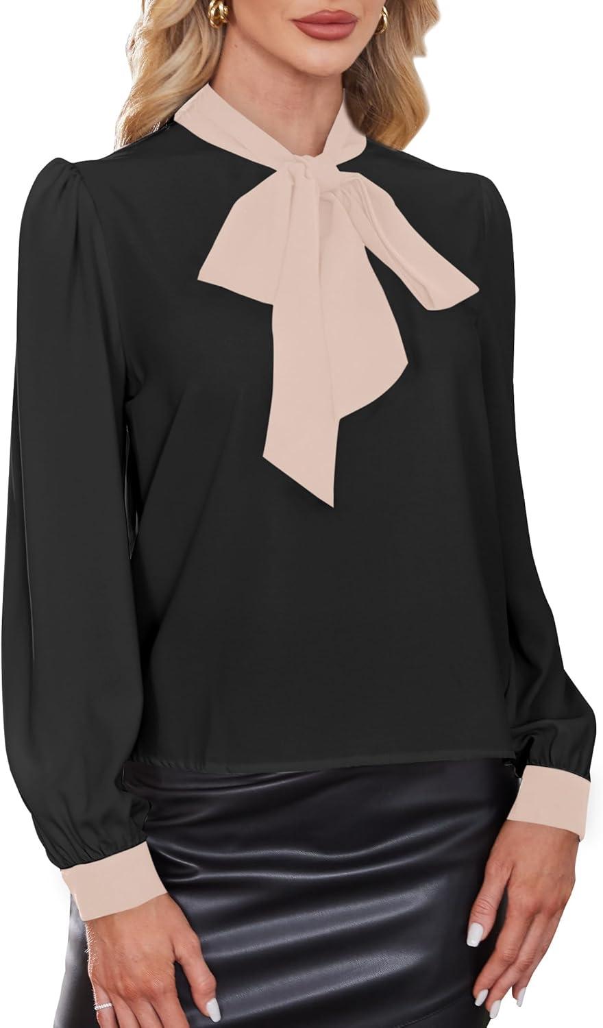 Avanova Women Tie Neck Bishop Long Sleeve Shirts Casual Work Blouses Tops(Black Beige)