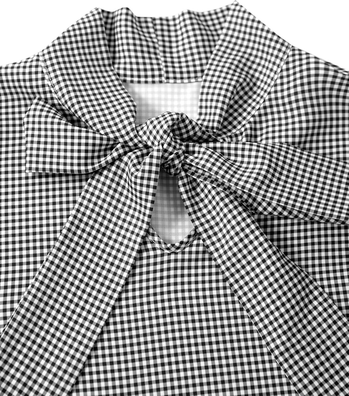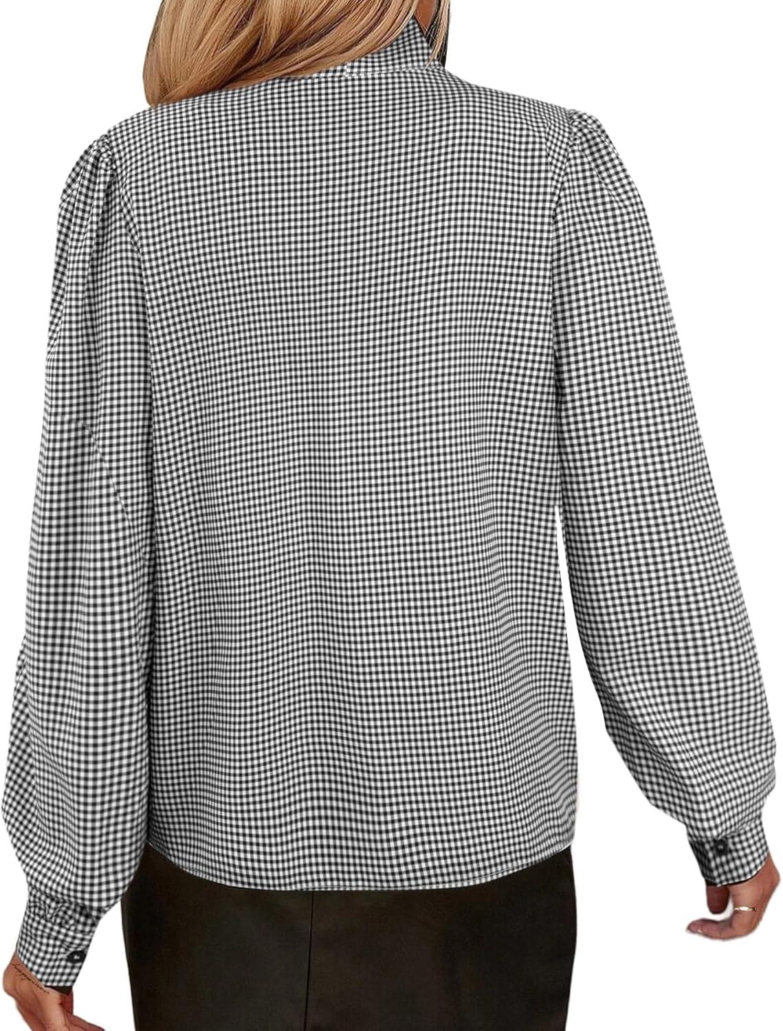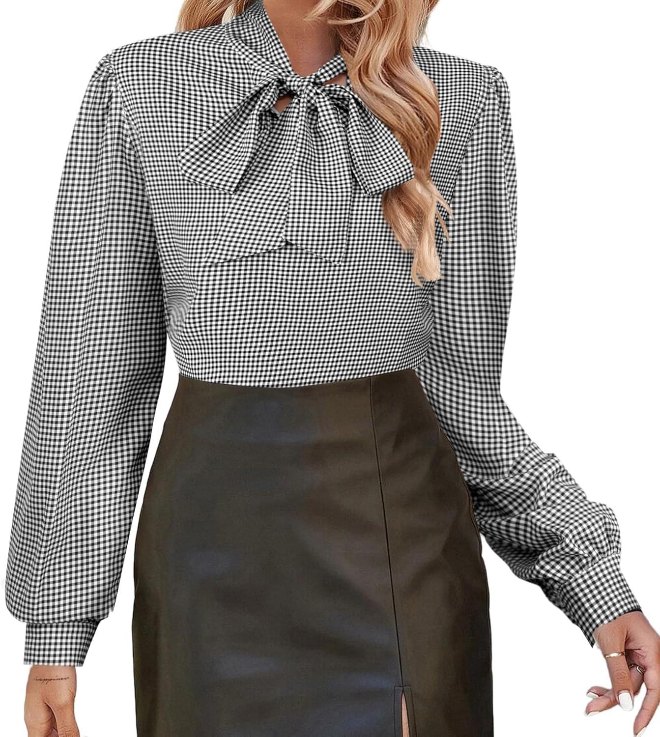 Avanova Women Tie Neck Bishop Long Sleeve Shirts Casual Work Blouses Tops(Black Checked)