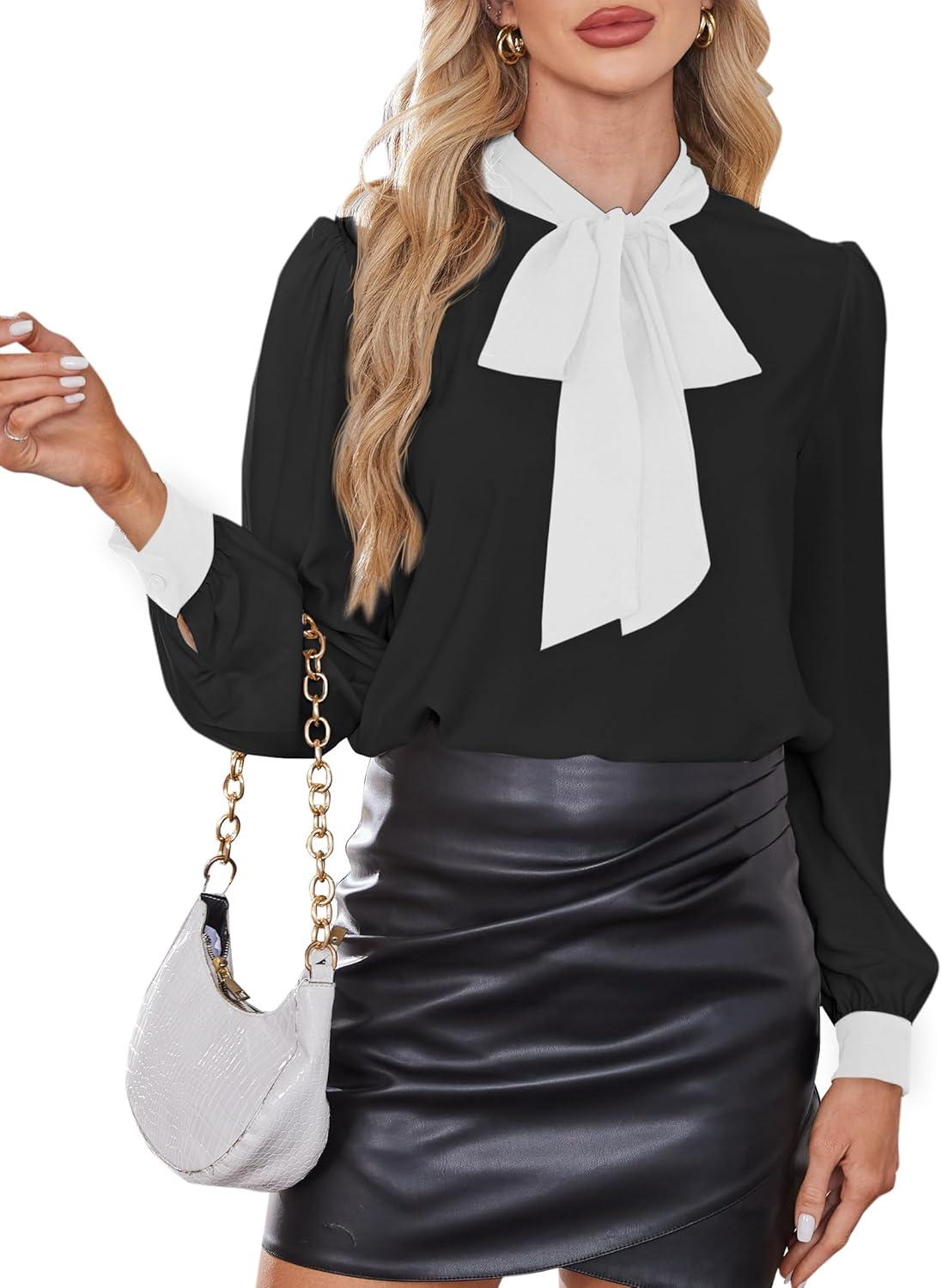 Avanova Women Tie Neck Bishop Long Sleeve Shirts Casual Work Blouses Tops(Black White D)