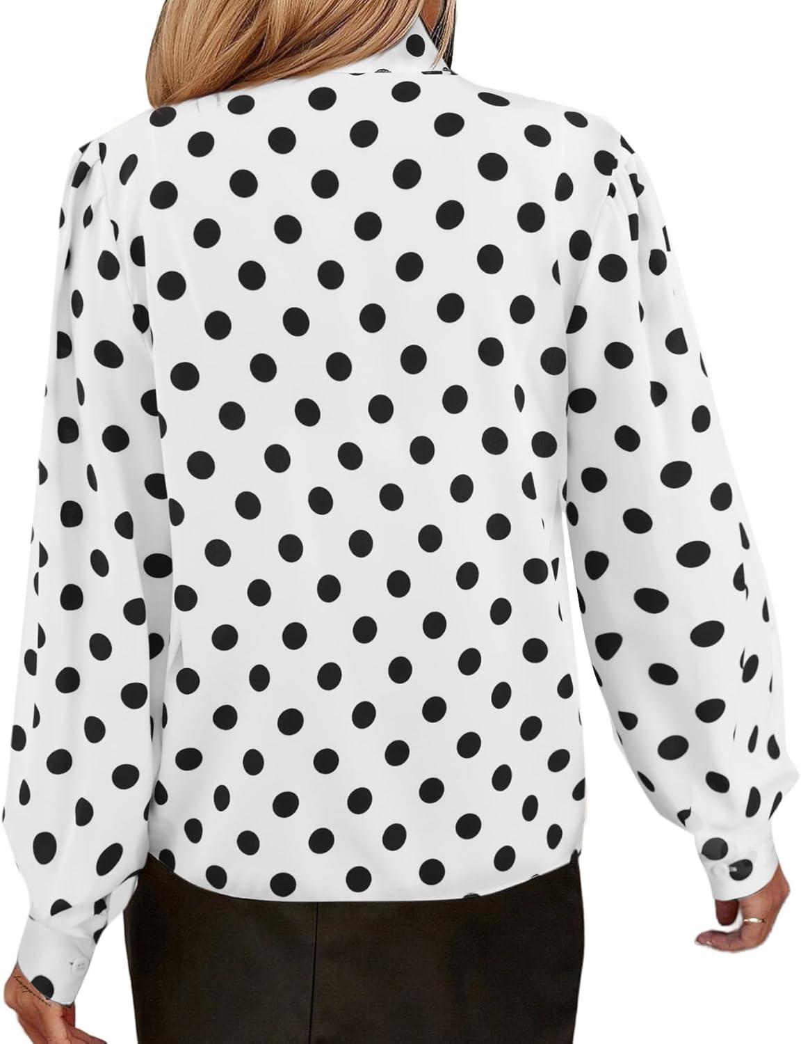 Avanova Women Tie Neck Bishop Long Sleeve Shirts Casual Work Blouses Tops(White Dots)