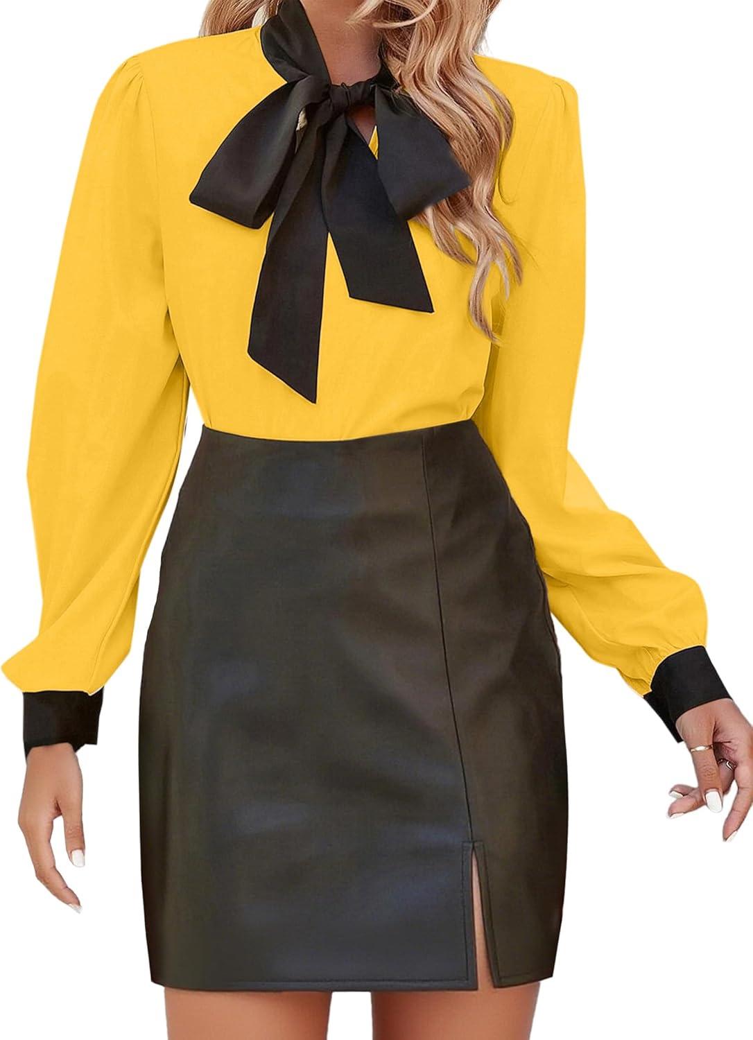 Avanova Women Tie Neck Bishop Long Sleeve Shirts Casual Work Blouses Tops(Yellow)