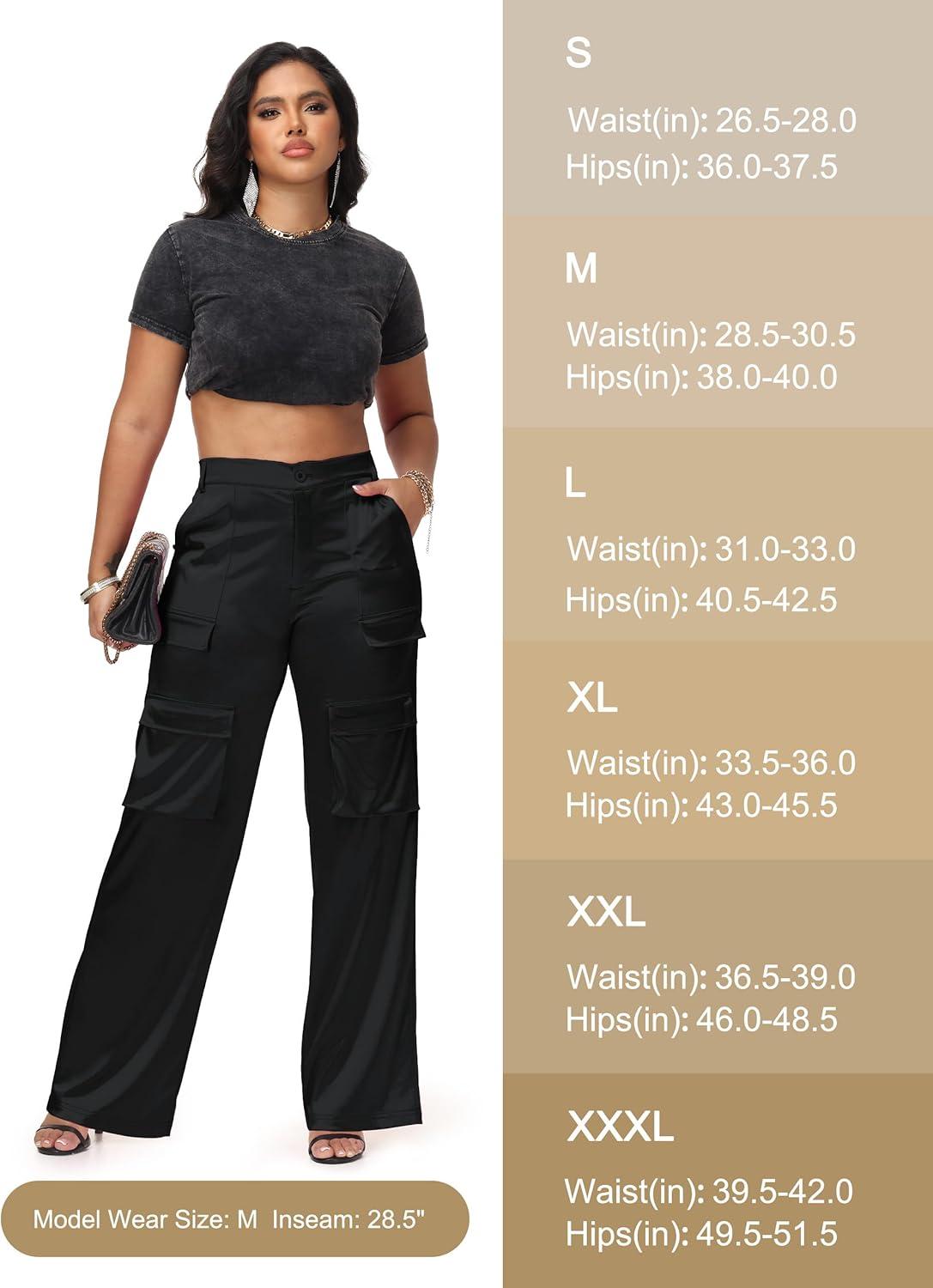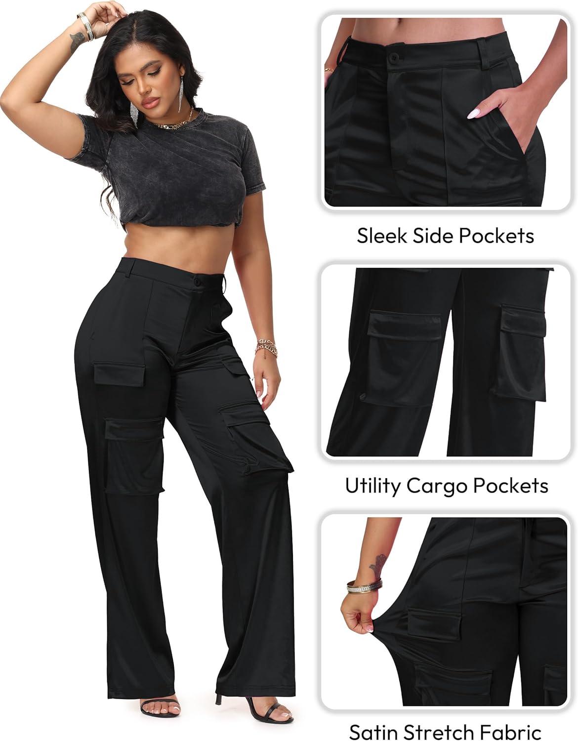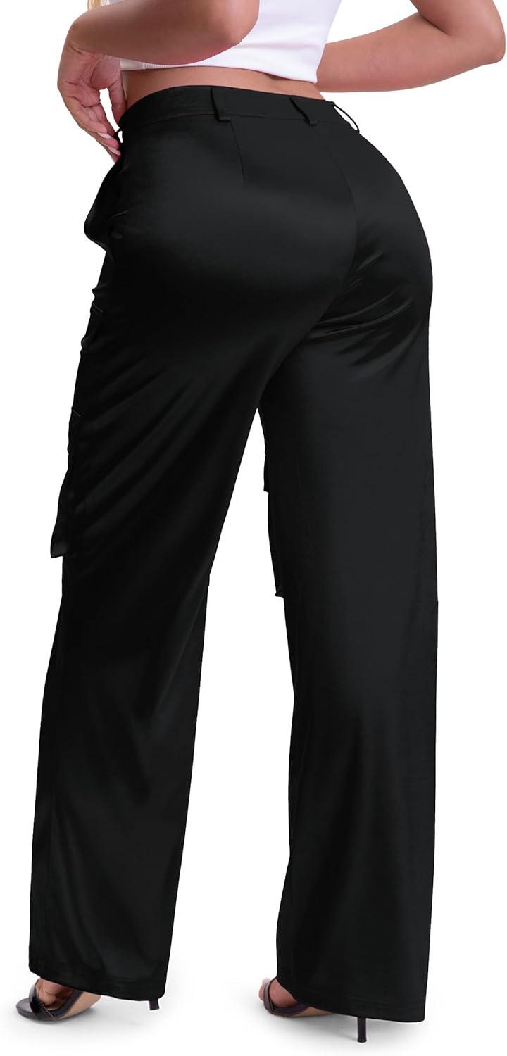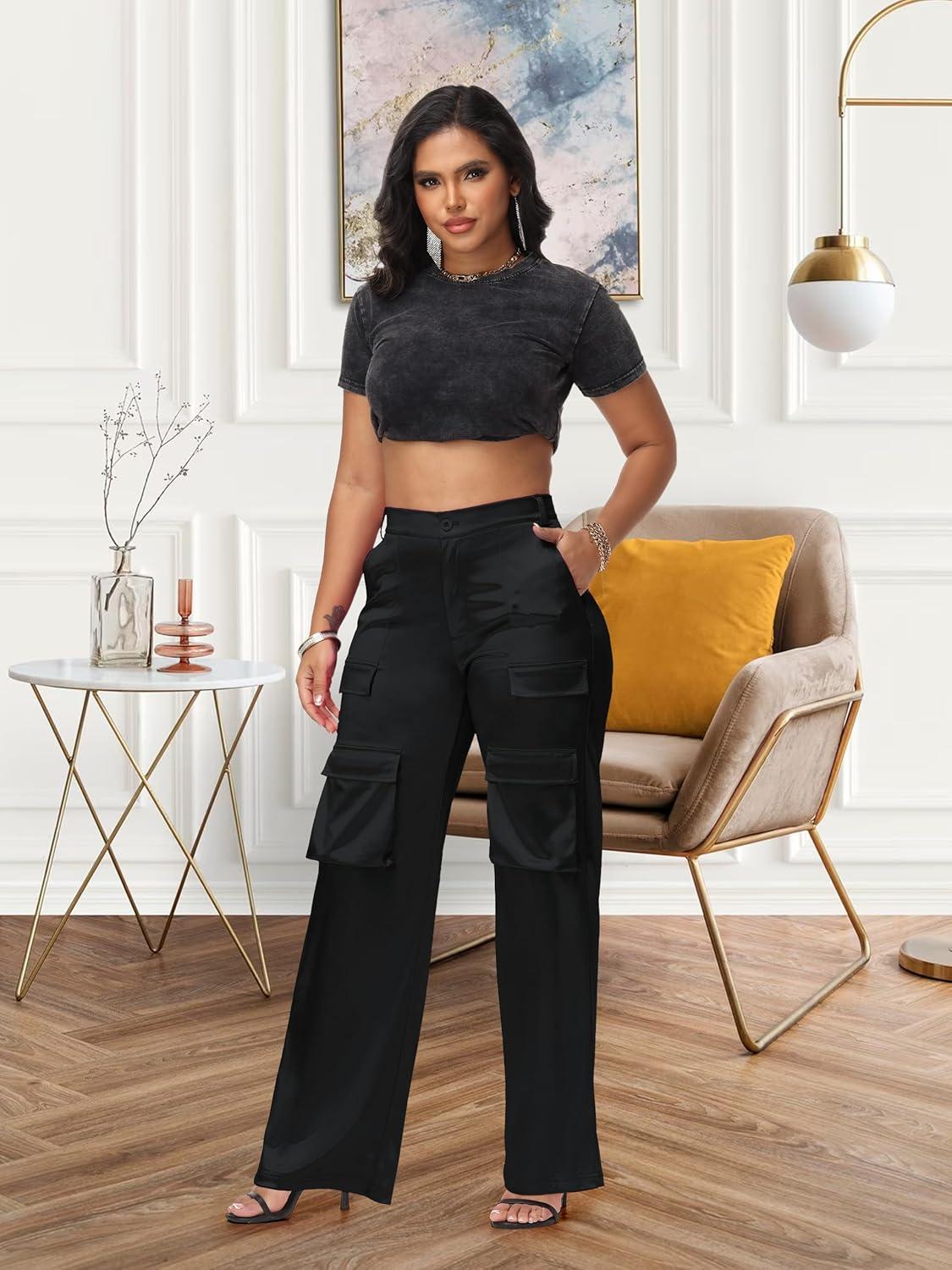 Tapata Womens Satin Cargo Pants 28.5/31 Inseam High Waisted Wide Leg Casual Straight Club Trousers Petite/Regular(Black)